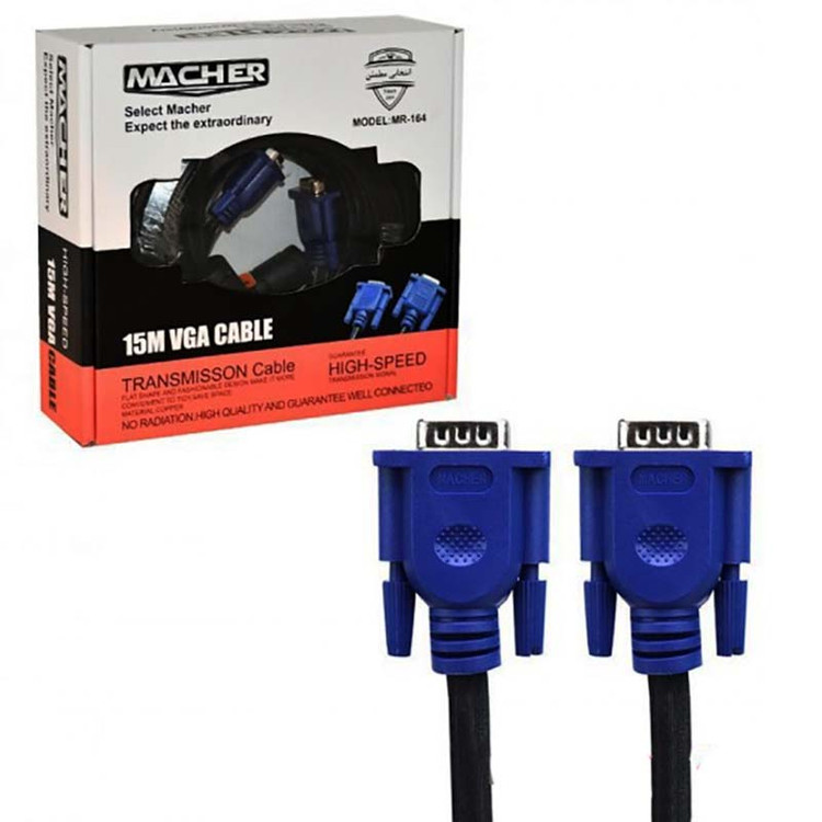 کابل VGA مدل LNG MR-164 یکی از جدیدترین تولیدات برند Macher می باشد. این محصول در واقع یک رابط VGA برای انتقال تصویر بوده و بسیاری از دستگاه ها از جمله مانیتور ها، لپ تاپ ها و ویدئو پروژکتور ها برای اتصال به رایانه و انتقال تصویر از پورت VGA بهره میبرند. در هر دو سمت این کابل یک کانکتور ۱۵ پین VGA قرار داشته که وظیفه آن انتقال تصاویر به صورت آنالوگ می باشد. طول کابل این محصول ۱۵ متر بوده و از آلیاژ مس در ساخت آن استفاده شده است. همچنین روکش آن از جنس TPE می باشد، که با توجه به طول این کابل در برابر گره خوردن و در هم پیچیدن از مقاومت بسیار خوبی برخوردار است. کابل تصویر VGA مچر مدل MR164 از رزولوشن ۱۰۸۰*۱۹۲۰ (FULL HD) پشتیبانی کرده و به دلیل استفاده از دو عدد نویز گیر در این محصول، همواره بهترین و با کیفیت ترین تصویر را به کاربر ارائه خواهد داد. ناگفته نماند که زاویه سوکت کابل وی جی ای Macher MR-164 بصورت استاندارد طراحی شده و علاوه بر آن جنس سر کانکتور این کابل از نوع آلومینیوم می باشد.